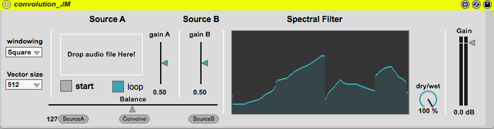 Este dispositivo permite hacer consolación entre dos fuentes de audio mediante FFT. Posteriormente se puede añadir filtrado espectral sobre la señal procesada.