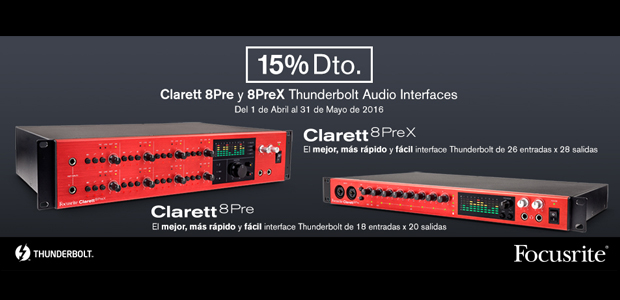 A partir del 1 de Abril y hasta el 31 de Mayo de 2016, los usuarios que compren cualquiera de las interfaces Clarett 8Pre o 8PreX de Focusrite están de enhorabuena, ya que podrán beneficiarse de un 15% de descuento (sobre el precio mostrado en nuestra web). Para ello, tan solo tendrán que copiar y pegar el código CLARETT durante el proceso de compra de su próximo pedido.
