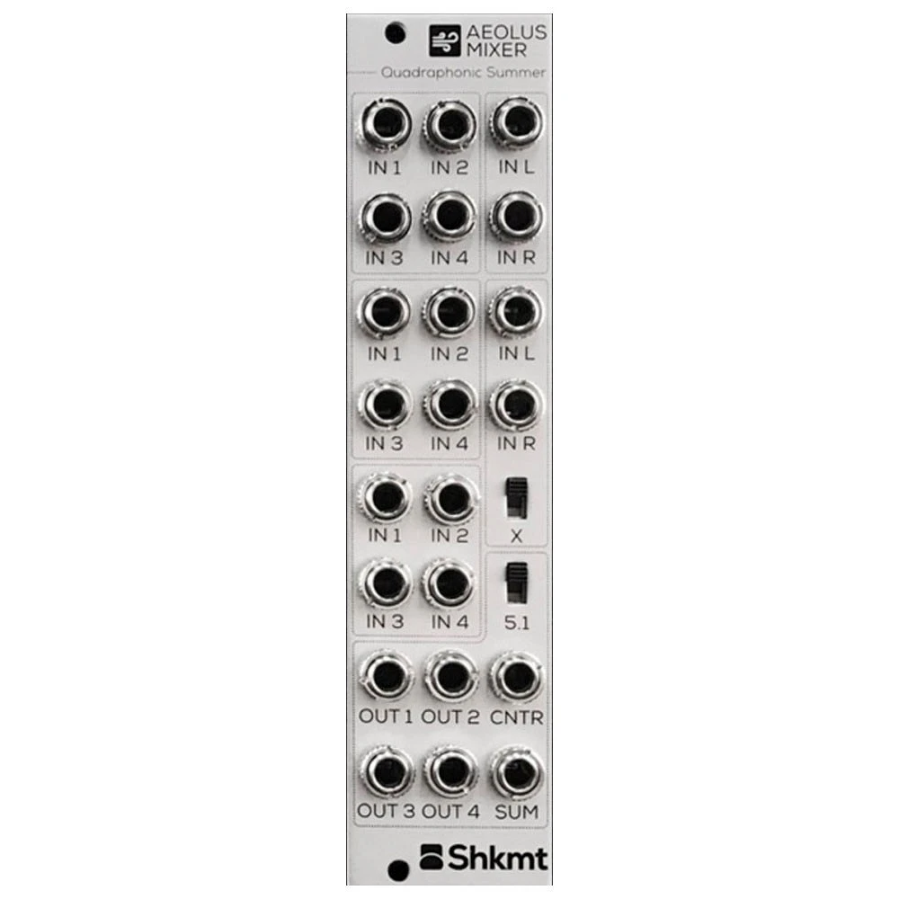 Shakmat Modular Aeolus Mixer es un módulo eurorack que funciona como mezclador y sumador cuadrafónico. Dispone de tres entradas cuadrafónicas y es capaz de sumar dos salidas estéreo junto a la salida cuadrafónica con compatibilidad 5.1