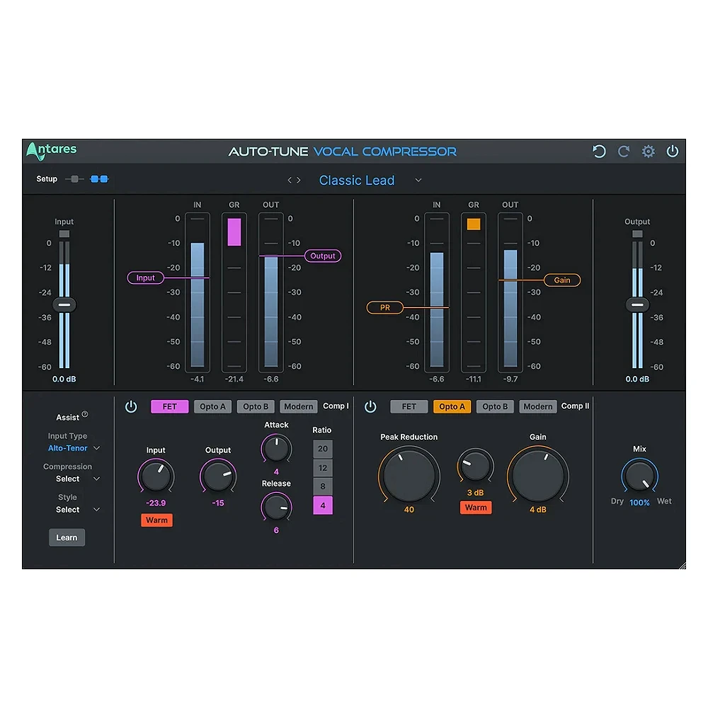 AutoTune Vocal Compressor, de Antares, es el primer plugin de compresión vocal de doble etapa potenciado por machine learning. Diseñado para brindar control dinámico preciso y carácter profesional a cualquier interpretación vocal, este plugin ofrece desde una compresión sutil y musical en modo de etapa única hasta una combinación avanzada de procesamiento en modo dual. Su motor inteligente analiza el audio en tiempo real, ajustando automáticamente los parámetros para resultados rápidos y efectivos.