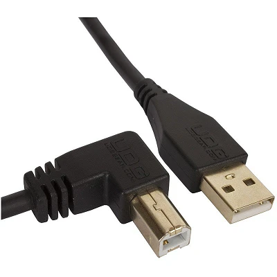 El cable UDG Ultimate Audio Cable USB 2.0 A B Black Angled 1m es ideal para conectar interfaces de audio, micrófonos USB, dispositivos USB-MIDI, ordenadores, etc