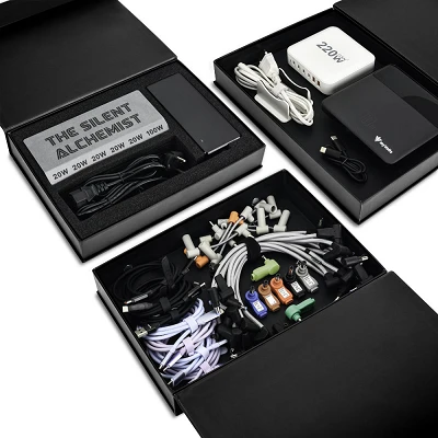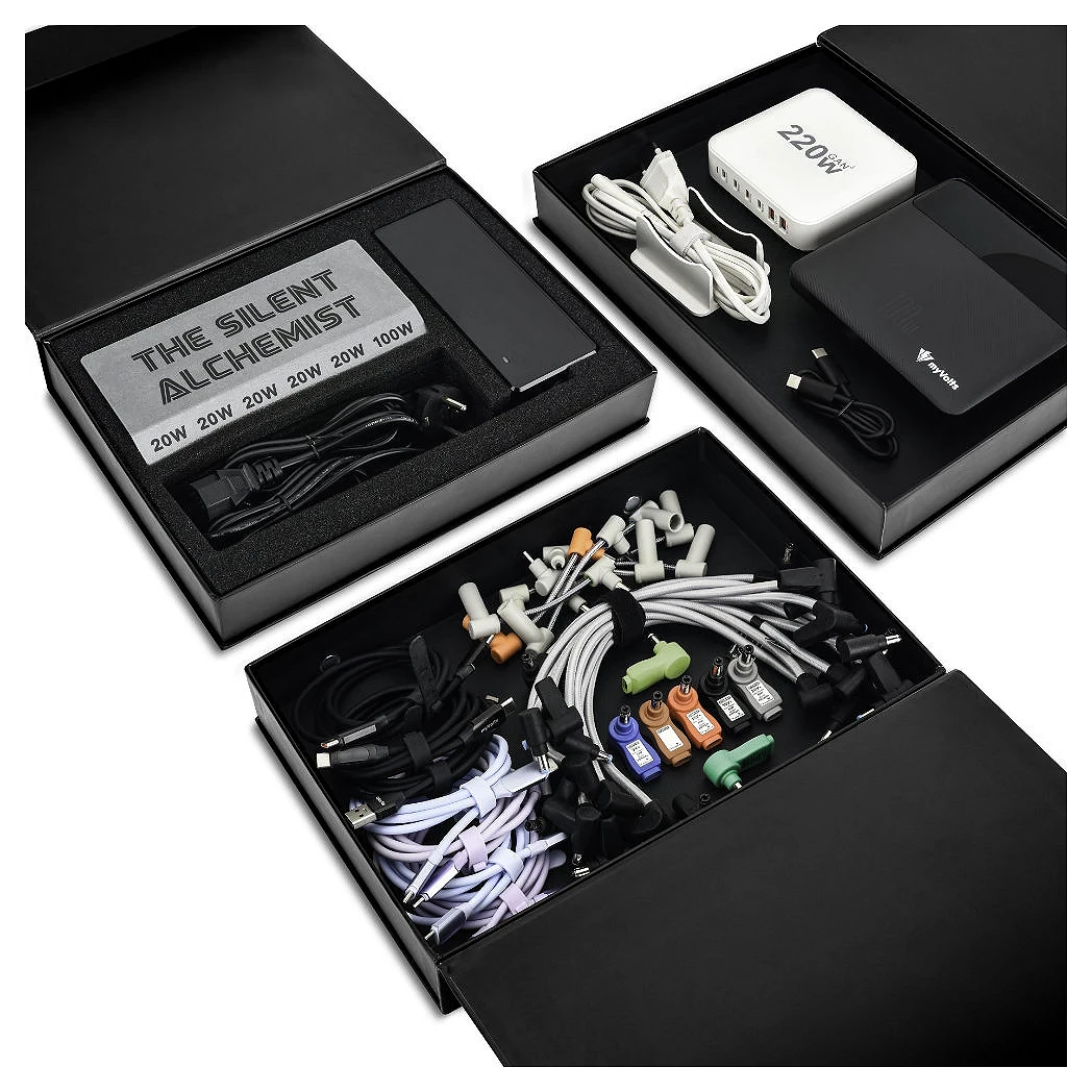 MyVolts Silent Alchemist Kit é um hub de alimentação USB com 7 portas USB isoladas multivolt, 10 conectores Step-Up, 7 cabos USB-C a USB-C Step-Up, 3 cabos USB-A a USB-C Step-Up, 1 Powerbank PDPB100 e 1 hub USB PDH220