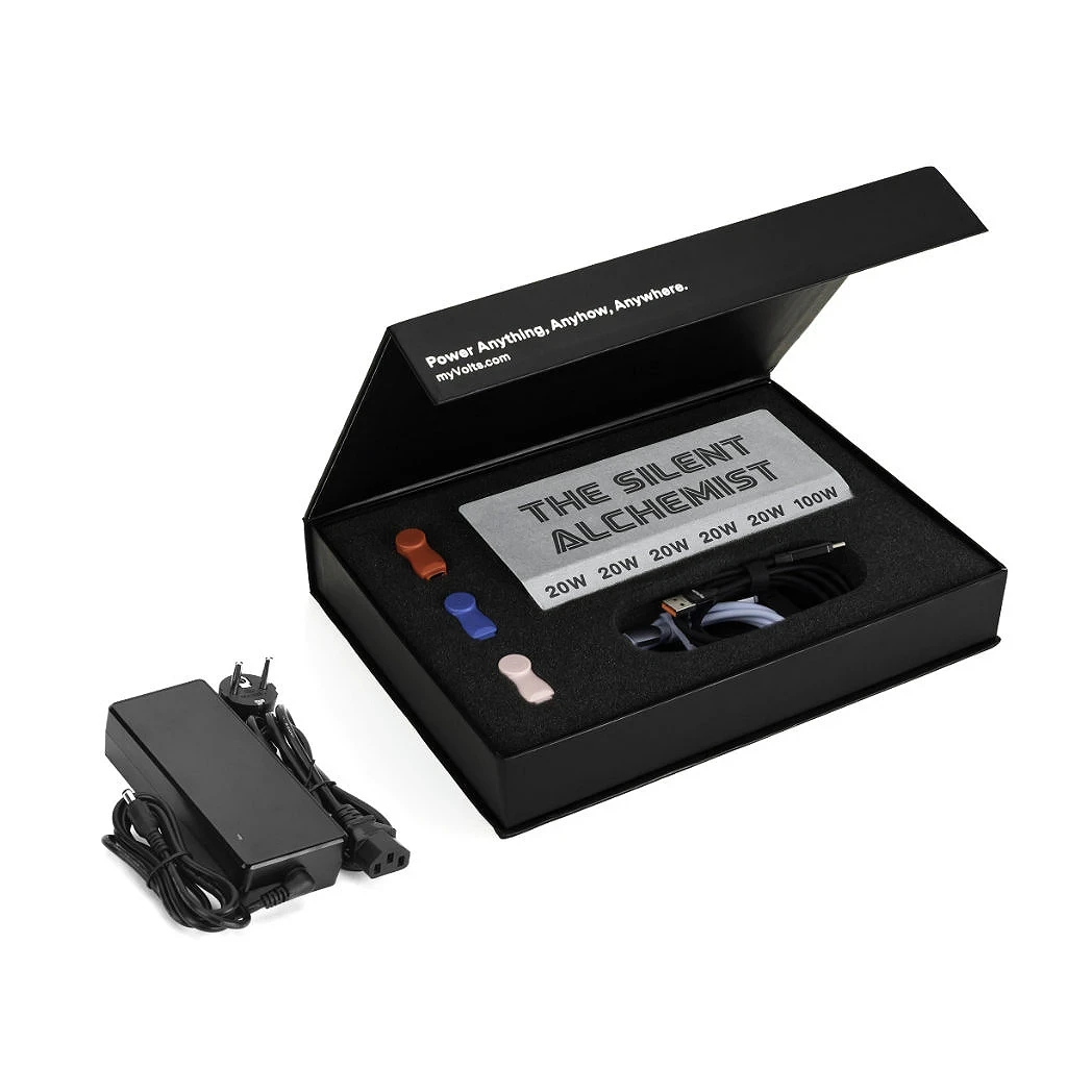 MyVolts Silent Alchemist Explorer's Kit é um hub de alimentação USB com 7 portas USB isoladas multivoltagem junto com cabos e conectores Step-Up