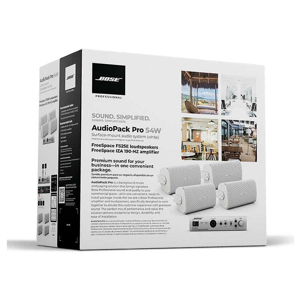 AudioPack Pro S4W White de Bose es una solución de música ambiental y megafonía con amplificador y altavoces listo para instalar.