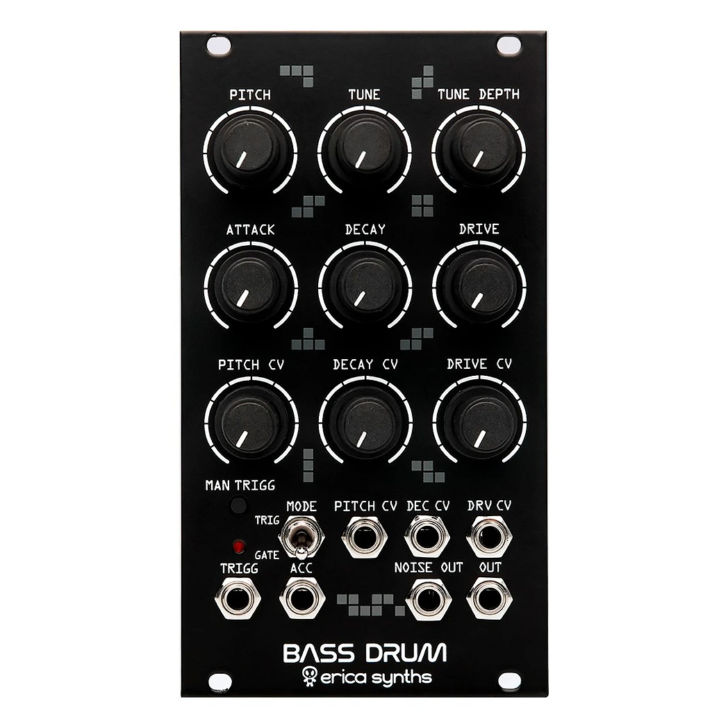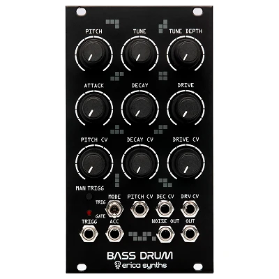 Erica Synths Bass Drum 2 permite conseguir sonidos de bombo tipo 909 con mucho cuerpo y pegada y dispone de controles para acento junto a otros parámetros. Respecto al anterior modelo, esta nueva versión incluye modos trig y gate, siendo capaz de crear sonidos sostenidos. Modulando la longitud de la puerta se pueden conseguir sonidos poco convencionales de bombo