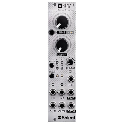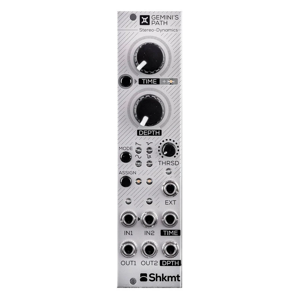 Shakmat Modular Gemini's Path es un módulo eurorack que funciona como VCA dual, capaz de funcionar en dual mono o estéreo y como procesador de panorama. Basado en un par de VCAs de alta calidad, un conversor de audio a trigger y una fuente de modulación inteligente, esté módulo permite un gran número de opciones como decay/gate sobre amplitud, acentuación automática, compresión sidechain, panorama automático y mucho más