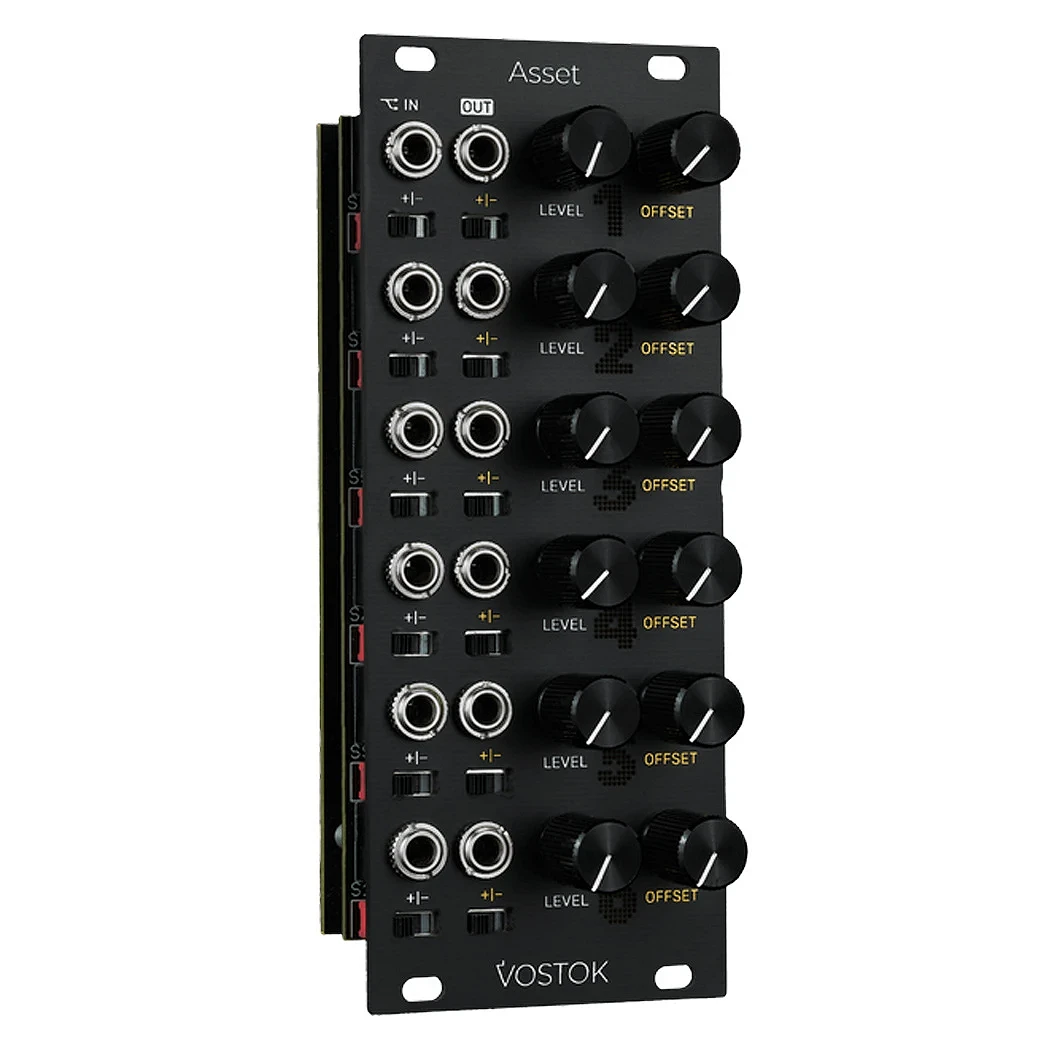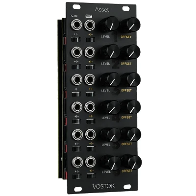 O Vostok Instuments Asset é um atenuador e gerador de offset de 6 canais em formato de módulo eurorack. Ter controle sobre a amplitude e polaridade dos sinais é algo muito necessário. O Asset foi projetado levando em consideração os sistemas eurorack compactos. Ele é muito compacto, mas oferece 6 canais com controles individuais para cada circuito. Foram tomadas algumas decisões de design que adicionam uma abordagem diferente aos circuitos "attenuverter" clássicos. Os potenciômetros operam de forma unipolar, permitindo atenuar completamente o sinal sem se preocupar com a posição central. Isso também adiciona mais precisão em todo o alcance do potenciômetro. Possui interruptores manuais para inverter o sinal e o offset é útil quando se deseja inverter o sinal. O encadeamento na entrada adiciona muita flexibilidade, permitindo usar o mesmo sinal várias vezes em diferentes modos, o que é ideal para patches polifônicos ou generativos.