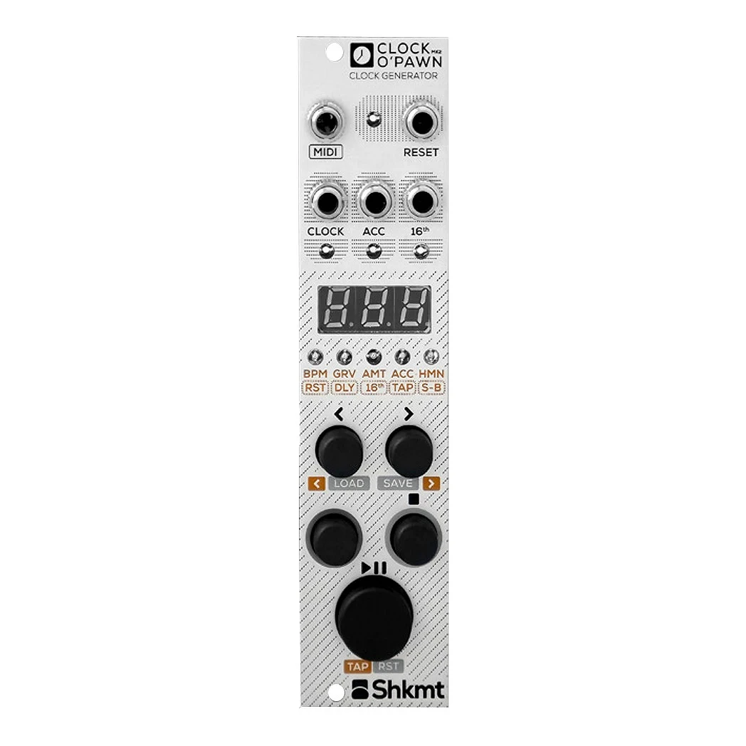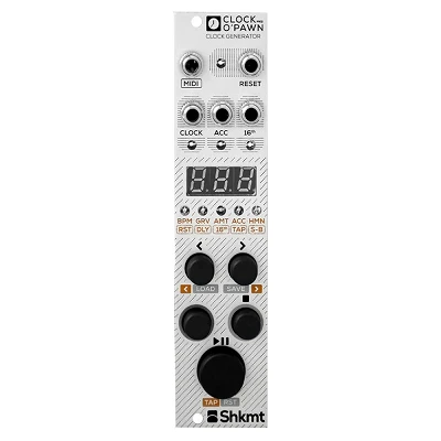 O Shakmat Modular Clock O'Pawn MK2 é um módulo eurorack que funciona como gerador de sinais de clock para sistemas eurorack. Ele inclui uma seção de transporte para reproduzir, pausar e redefinir os instrumentos conectados que necessitam de sincronia. Além disso, oferece funções avançadas de swing.