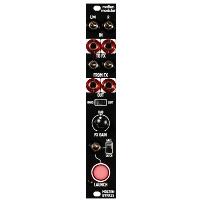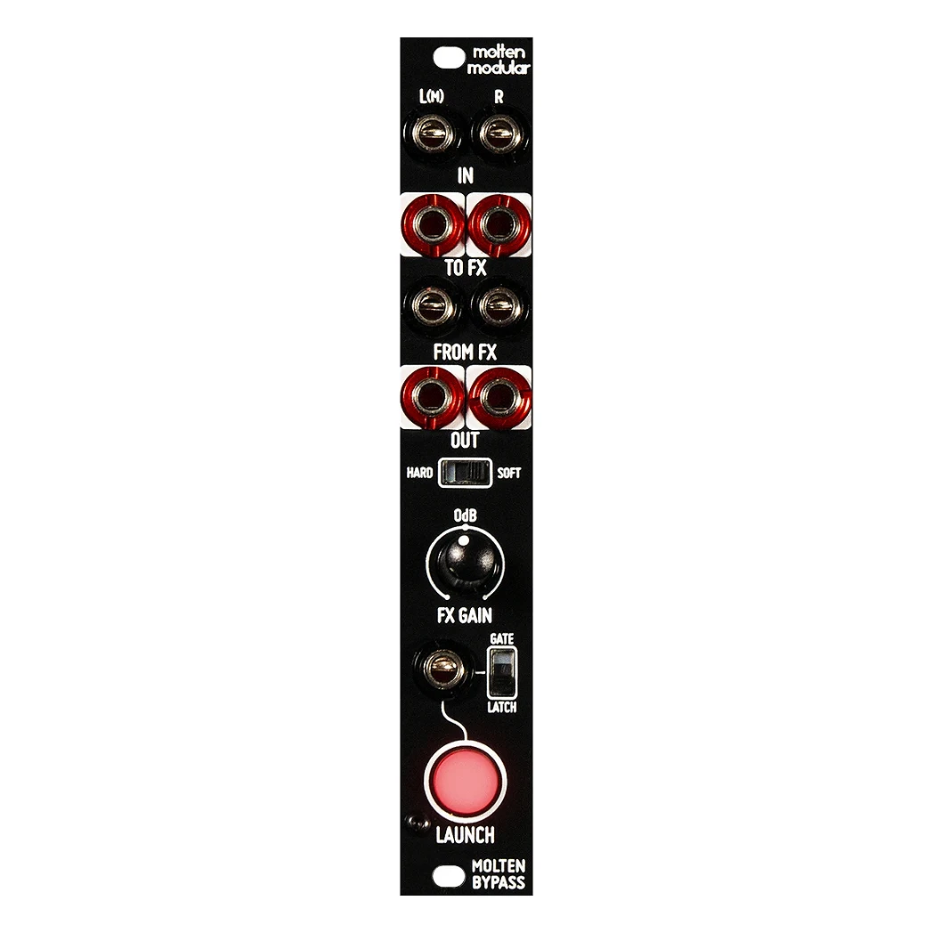 Befaco Molten Bypass é um módulo projetado em colaboração com a Molten Music Technology que funciona como bypass estéreo para gerenciar o envio de sinais aos seus efeitos favoritos. Oferece um controle de bypass hard/soft que permite cortar o retorno do efeito de forma abrupta ou mais suave. O controle gate/latch permite usar sinais de trigger ou gate para ativar ou desativar a função do módulo, juntamente com um controle de ganho do sinal retornado.