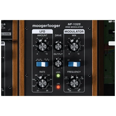 O modulador em anel MF-102S é uma reinvenção do clássico pedal de efeitos analógicos MF-102 da Moog Music, que além de modulador em anel, também é um oscilador portador controlado por voltagem e um oscilador de baixa frequência (LFO) de forma de onda dupla controlado por voltagem.