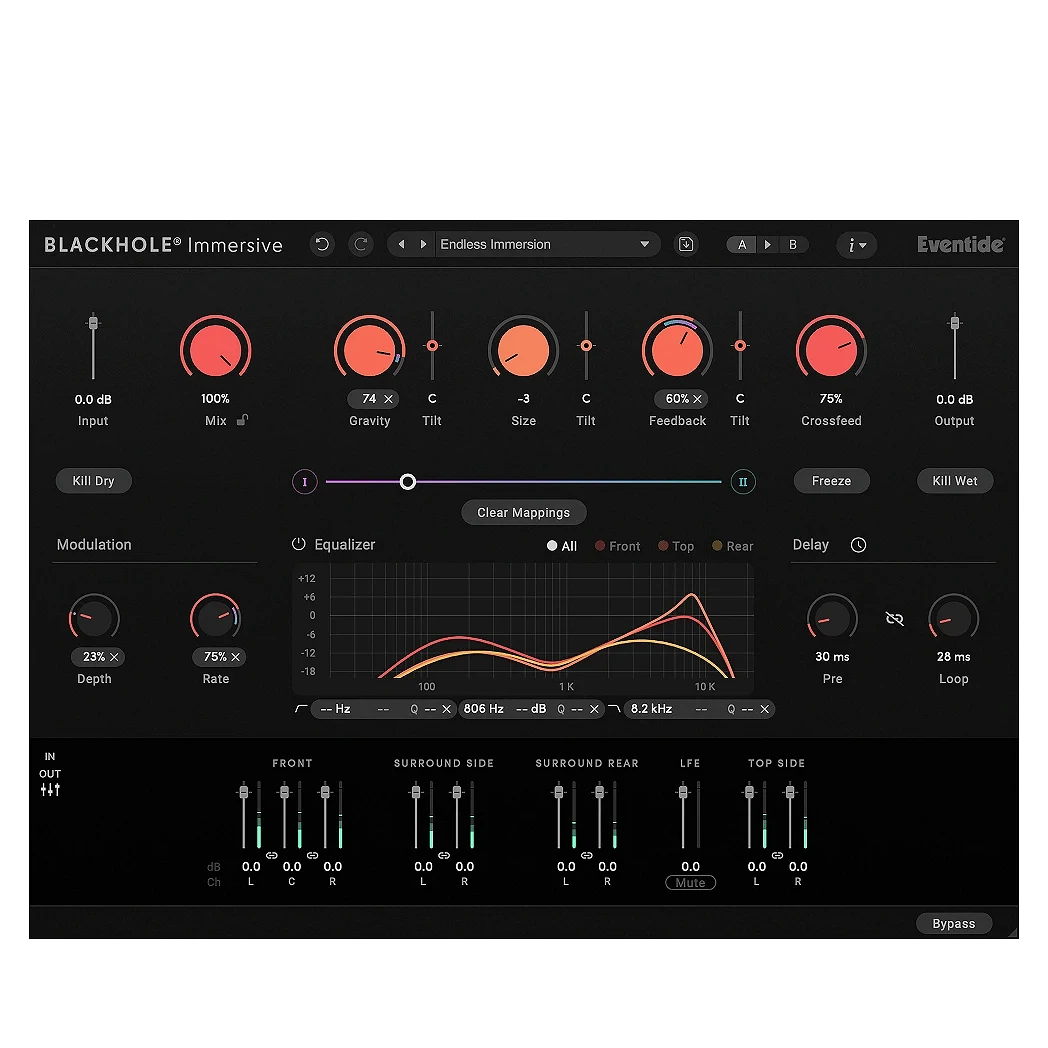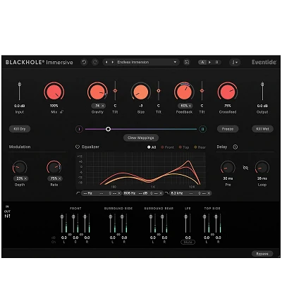 Projetado desde o zero para fluxos de trabalho imersivos, Dolby Atmos e envolventes, Blackhole Immersive expande o som característico da versão estéreo da Eventide por toda a sua mistura imersiva. Utilizado como envio ou inserção, Blackhole Immersive continua a respeitar, mas ser reativo ao posicionamento cuidadosamente escolhido da faixa.